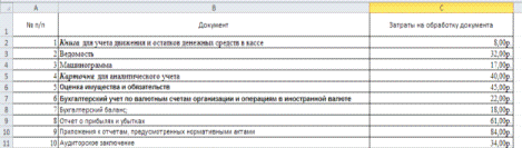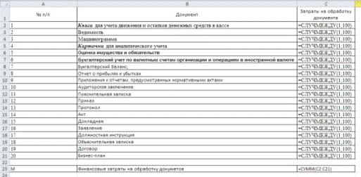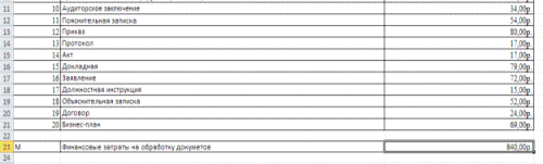 формуле:=СУММ (C2:C21) - общая сумма по затратам на обработку документа.