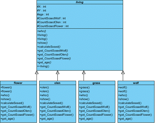 living():X(0),Y(0),age(0),next(0),CountSosedWolf(0),CountSosedOlen(0),(0)