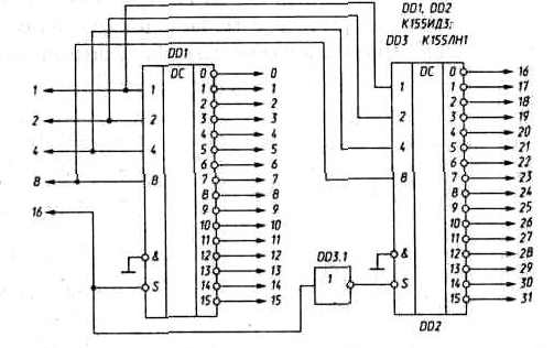 можна зібрати дешифратор на 32 виходи (рис. 13).
