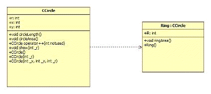 Клас Ring наслідує клас CCircle, містить в собі дані кільце, його внутрішній радіус, а також