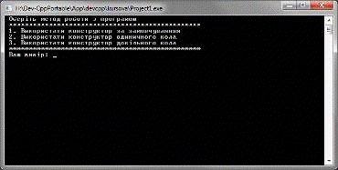 std::cout<<" Оберіть метод роботи з програмою"<<endl;