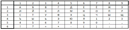 этом шифре каждый символ (буквы алфавита, цифры от 0 до 9 и некоторые символы