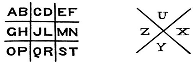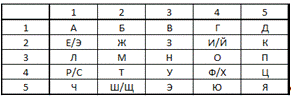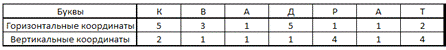 сверху), знаменатель - номер буквы в строке (слева направо).