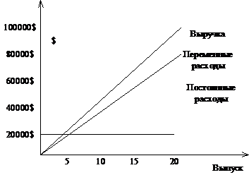 выручки и линия переменных расходов исходят из одной точки и разница между ними