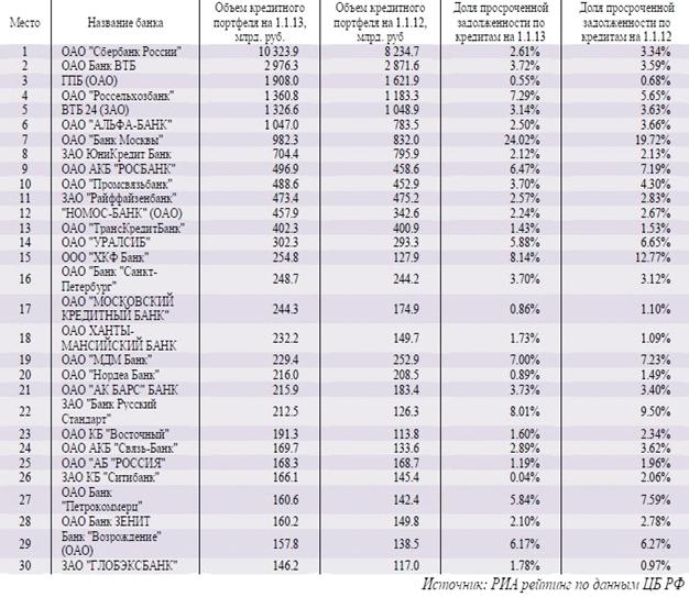 Ссудный портфель у 30-ти крупнейших банков России на 1 января 2013 года