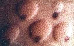 вокруг глаз, на стенках грудной и брюшной полости. На местах алопеции кожа
