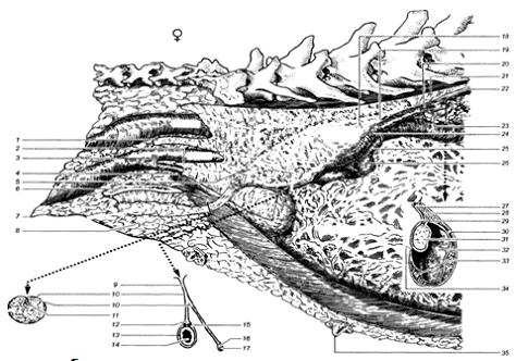яйцевода; 3l - яичник; 32 - яичниковая бурса; 33 - яйцевод; 34 - отверстие