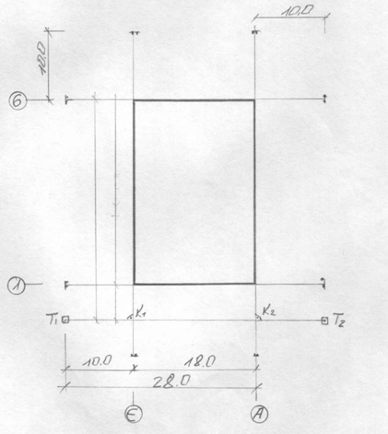 це і буде точка Є-1 перетину вісей будівлі. Від точки Т-1 відкладаємо відстань