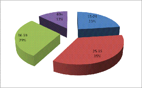 23 %, від 25 до 35 - 35 %, від 36 до 59 - 29 %, старше 60 - 13 %. Представимо