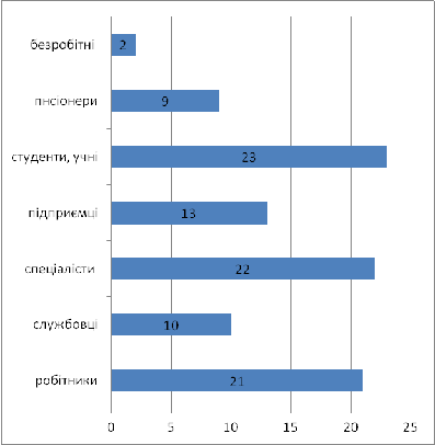 23 %),спеціалістів (22 %) та робітників (21 %). Опитаних, що займаються іншою