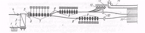 летючі ножиці; 11 - холодильник; 12 - моталки, 13 - транспортер для бунтів; 14