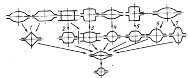 ножиці; 7 - чорнова група; 8 - летючі ножиці, 9 - чистові групи клітей; 10 -