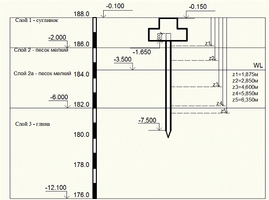 планировочной отметки на глубину 2,55м свая прорезает два слоя грунта.