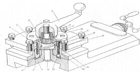 поворота и закрепления четырехпозиционного резцедержателя, 10 - рукоятка