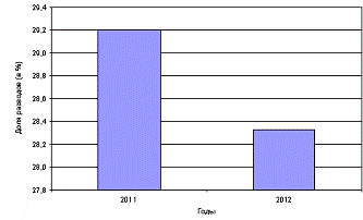 Рис. 2 - Доля разводов от общего количества заключенных браков, г.