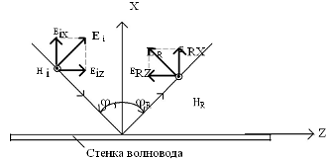В вертикально поляризованной волне вектор падающей на стенку волны Ei, вектор отраженной от стенки волны ER лежат в