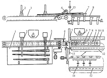 механизма 13, приемного стола 8 с системой отмера длин 7 и