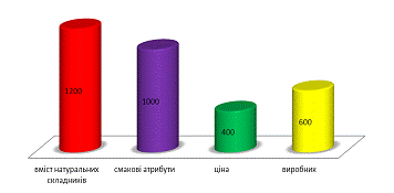 смакові атрибути, 600 балів має виробник підприємства, а найменш ціна товару