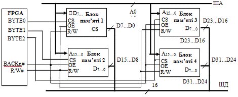 адреса комірки пам’яті надходить на всі блоки, але формується лише сигнал BYTE0,