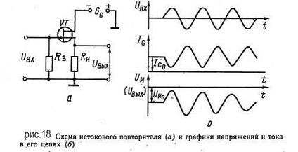 т.е. с истока ПТ (рис.18, б), имеет такую же форму, что и входное напряжение.