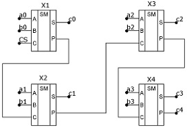 последовательно 4 включённых полных сумматоров, а умножитель, в свою очередь, 3