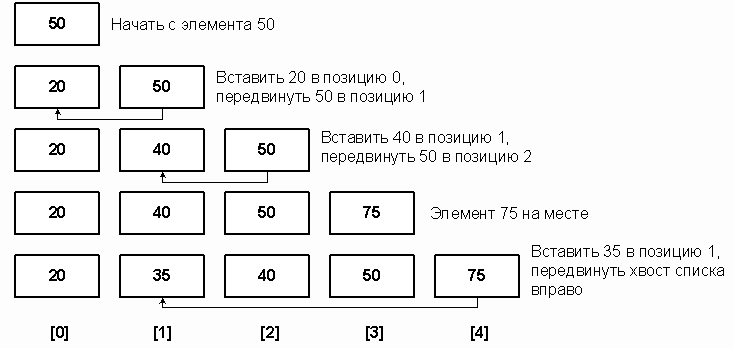 элемент A[i] и будем продвигать его к началу списка, сравнивая с элементами