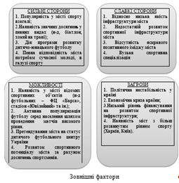 слабких сторін, а також можливостей та загроз спорту у Сумах подано у таблиці.
