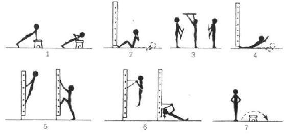гимнастической стенке, ноги на 3-й рейке, руки на уровне головы. Согнуть левую