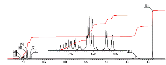 химическим сдвигом 3,9 м.д. можно отнести к C6H5-O-CH3. Другой сигнал,