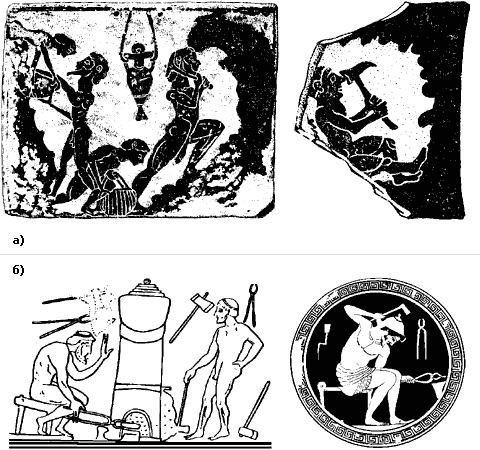 греческой керамике: а) рудокопов; б) кузнецов