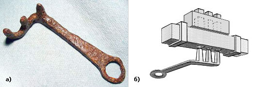 применяли Г-образные ключи. На рис.8а показан найденный в Греции железный ключ.