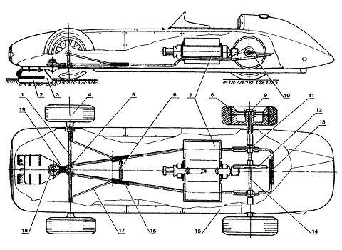 схему електромобіля. Він складається з рами 9, до якої на гумових подушках