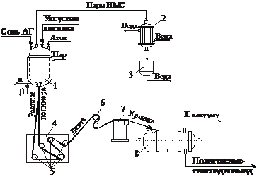 полиамида-66: 1 - реактор-автоклав поликонденсации; 2 - холодильник; 3 -