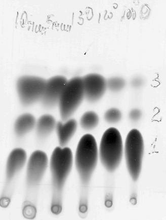 Рис. 2. Хроматографическая пластинка. (Sorbfil): 1 - исходное