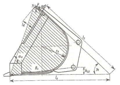 линию, параллельную передней стенке ковша, и получаем угол α0 с осью