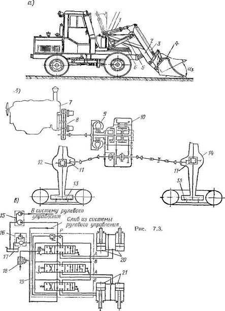 распределитель; 20 - цилиндры ковша; 21 - цилиндры для стрелы