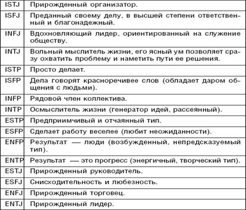 ISFP, INFP, INTP, ESTP, ESFP, ENFP, ENTP, ESTJ, ESFJ, ENFJ или ENTJ.