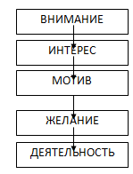 этапы: внимание, интерес, мотив, желание, деятельность.