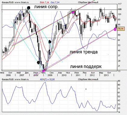 выбранного периода. Наклон линии вниз - тренд падающий, вверх - восходящий.