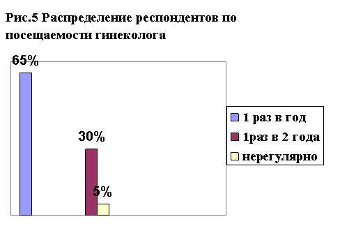 обследования у гинеколога каждый год- 65%, каждые два года- 30% и 5% посещают
