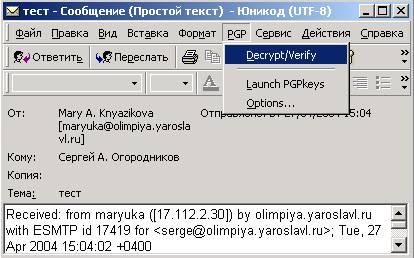 получении зашифрованного письма, откройте его и в меню «PGP»