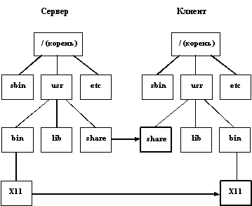 системы-сервера (share и X11) монтируются к двум (пустым) каталогам файловой