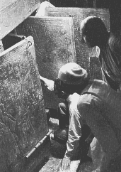 Справа: Говард Картер и его ассистенты перед саркофагом фараона.