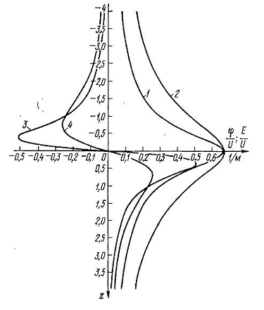 Рис.5.1 Распределение потенциала (кривые 1,2) и напряженности поля