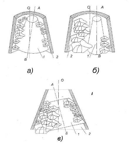 дробилках с крутым конусом (рис. 2, б) круговые колебания внутреннего конуса 1
