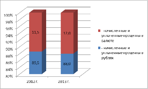 выплачивается в рублях - 88,0% в 2013 г. от общей суммы процентных расходов.