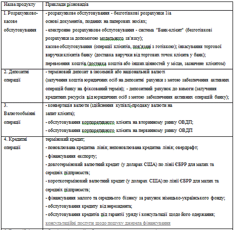 У таблиці 4 подано перелік основних базових продуктів комерційних банків.