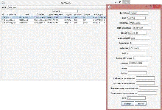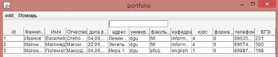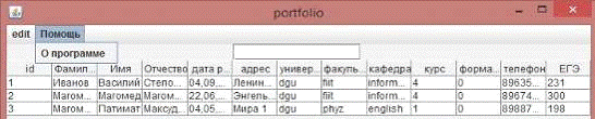Java7. Данная база данных содержит основные характеристики портфолио студента: