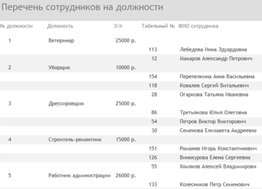 5.2 Перечень работников, которые устроились работать в зоопарк,