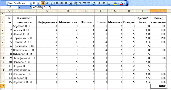 Определение размера стипендии для каждого студента -=ЕСЛИ(И(C3>2;D3>2;E3>2;F3>2;G3>2;H3>2);ЕСЛИ(И(I3>=3;I3<3,5);600;ЕСЛИ(И(I3>=3,5;I3<4);800;ЕСЛИ(И(I3>=4;I3<4,5);1000;ЕСЛИ(И(I3>=4,5;I3<5);1200;ЕСЛИ(I3=5;1500)))));0)